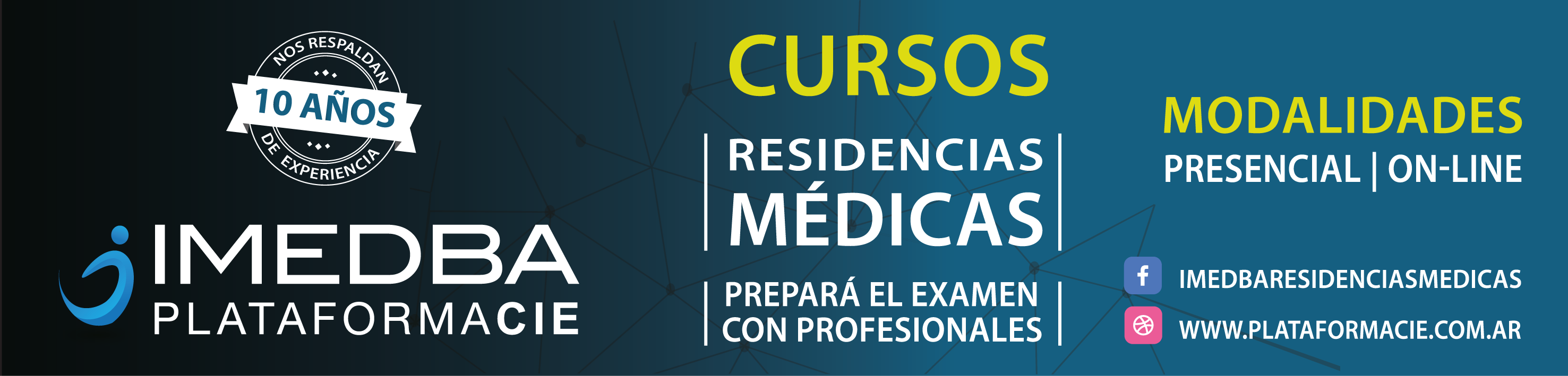 ImedBA. PlataformaCIE propone un curso de capacitación que permite a las y los alumnos preparar su examen de ingreso a una residencia médica de manera única, desde su hogar y con la posibilidad de disponer del material didáctico en todo momento utilizando cualquier dispositivo móvil de uso frecuente. Las clases, dictadas por profesionales de la medicina y orientadas para esta modalidad de exámenes de opción múltiple, junto a las diversas herramientas pedagógicas, biblioteca virtual, 6 manuales de texto con ilustraciones originales y exclusivas clases de repaso en formato multimedia para reforzar temas relevantes, junto al acompañamiento personalizado del tutor, hacen de nuestra plataforma un diseño exclusivo y único dentro de las variadas ofertas de métodos de estudio.